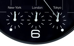 See what time it is all over the world. High-precision quartz system. ON TIME allows you to choose four different time zones worldwide. For example France, London, Tokyo and New York. Fitted with glass front. Dimensions 30.5 cm. Four 1.5 V AA batteries included